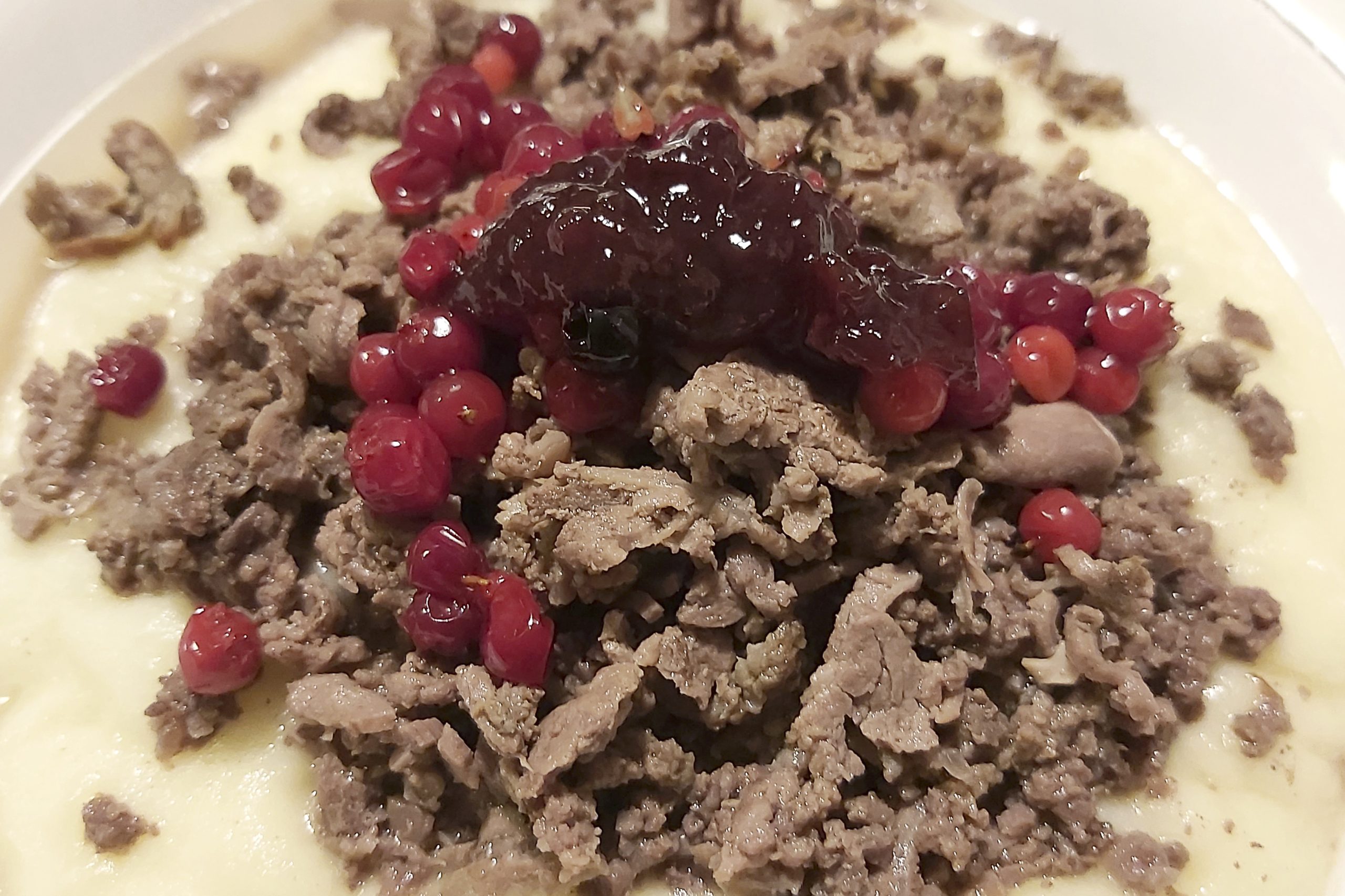 Kielas: Un plato estrella que incluye filete de reno, puré de patata Puikula (una variedad local muy cremosa), morcilla de reno, liquen de arándanos y salsa de balsámico con bayas.